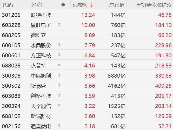 格隆汇10月28日|A股市场CPO概念股继续强势,其中,联特科技涨超13%,景旺电子(603228)10CM涨停,德科立涨超8%,永鼎股份(600105)涨超7%,方正科技(600601)涨超6%,杰普特涨超4%,中际旭创(300308)、新易盛(300502)、剑桥科技(603083)、天孚通信涨超3%。值得注意的是,方正科技、中际旭创、新易盛、斯瑞新材再创历史新高。