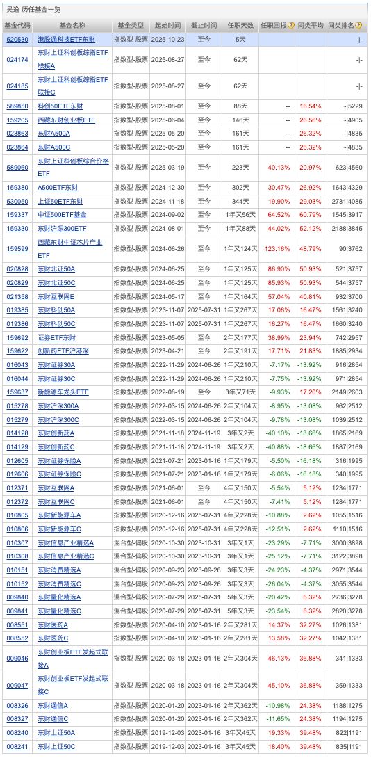 2、ETF主题机会 在“DeepSeek的创新热”过后,全球大模型领域的竞争节奏并未减慢,而是呈现密集迭代的态势。随之而来的是全球资本开支高景气,算力基础设施的军备竞赛不断加速。随着AI Agent迎来爆发元年,应用端正在加速成熟;AI Agent应用百花齐放,B/C两端协同共进。因此,人工智能应用有望加速落地。可关注创业板人工智能相关ETF产品。 四、明日重点关注新发基金1、基金简称:港股通科技ETF东财 基金类型:股票型证券投资基金 基金经理:吴逸 业绩比较基准:中证港股通科技指数收益率 基金经理过往业绩: