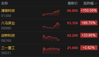 今日4只新股上市,滴普科技涨超150%,八马茶业涨超86%,剑桥科技(603083)涨超33%,三一重工(600031)涨超2%。
