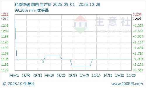 生意社10月28日讯 一、价格走势 据生意社商品分析系统显示,10月21日至28日轻质纯碱市场均价维持在1186元/吨,纯碱价格走势延续平稳。