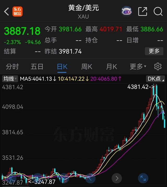 截至发稿,现货黄金跌幅收窄至12.08%,报3898.9美元/盎司。较10月21日高点4381美元/盎司跌超10%。