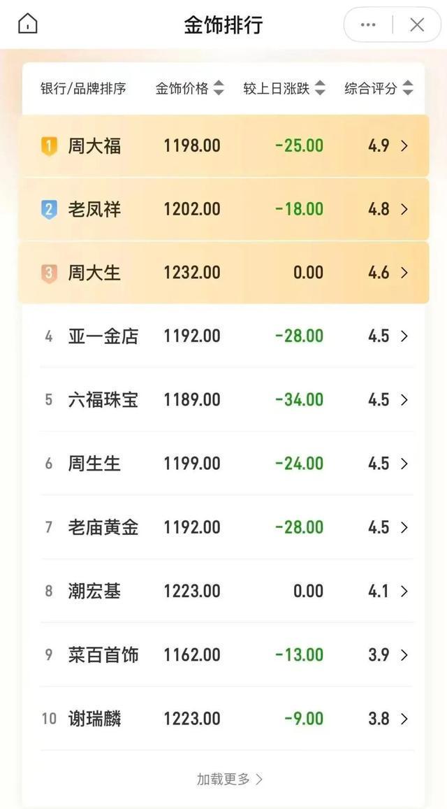 国际金价下跌,国内金饰零售市场价格也随之调整。今日上午,周大福金饰挂牌价调至1198元/克,较昨日下跌25元/克;六福珠宝跌破1200元/克至1189元/克,较昨日下跌34元/克。