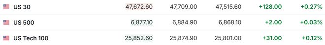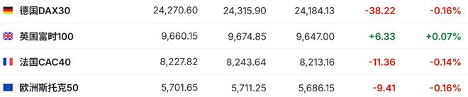 2. 截至发稿,德国DAX指数涨0.16%,英国富时100指数跌0.07%,法国CAC40指数涨0.14%,欧洲斯托克50指数涨0.16%。