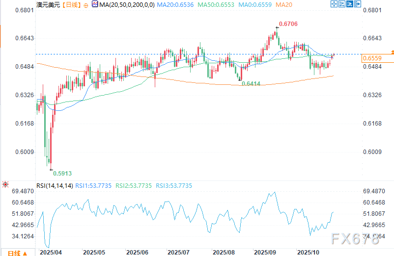 周二(10月28日)欧盘时段,澳元兑美元日内以震荡为主。近期贸易紧张局势缓解,且交易员正等待美国与澳大利亚的关键事件,澳元兑美元货币对跳空高开,攀升至10月10日以来的最高水平。该货币对从本月0.6440的低点上涨,最高触及0.6563。 ![]() 过去几日,澳元兑美元汇率呈强劲上升趋势,这源于交易员对中美贸易进展的乐观预期。中美双方已达成部分协议,美国大概率会降低对中国商品的现有关税。 特朗普对即将在韩国亚太经合组织(APEC)峰会期间与习近平主席的会面也表现出更高期待,双方将在峰会上商讨贸易及其他议题。 对澳元而言,中美若达成互利贸易协议将构成利好。中国是澳大利亚商品的重要采购国,协议落地将直接提振澳元需求;同时,这也会削弱美元的避险吸引力。 澳元兑美元汇率的下一个关键推动因素,将是周三即将公布的美联储利率决议。投资者预计,本次会议美联储将降息0.25%,并结束量化紧缩政策。 两项关键数据推高了美联储降息的概率。周五发布的报告显示,美国9月通胀增速低于预期;此外,美国自动数据处理公司(ADP)的报告显示,9月美国私营部门减少了超3.6万个工作岗位。 澳大利亚最重要的数据将于周四公布——统计局将发布第三季度最新通胀报告。该报告将为澳大利亚储备银行(央行)下周的会议提供决策参考。 技术分析 ![]() 日线图显示,澳元兑美元汇率在10月14日触及0.6440的低点后反弹。这一低点是重要支撑位,且与今年4月以来连接各次最低波动点的上升趋势线重合。 该货币对已突破50日指数移动平均线(50-dayEMA),这表明多头已掌控市场主导权。此外,相对强弱指数(RSI)已突破关键点位,且呈向上走势。 因此,澳元兑美元最可能的走势预测是延续涨势,多头目标指向下一关键阻力位0.6650。 看涨观点 买入澳元兑美元货币对,设置止盈位为0.6650。设置止损位为0.6450。时间周期:1-2天。 看跌观点 卖出澳元兑美元货币对,设置止盈位为0.6450。设置止损位为0.6650。 北京时间19:01,澳元/美元报0.6559/60,涨幅0.08%。 |