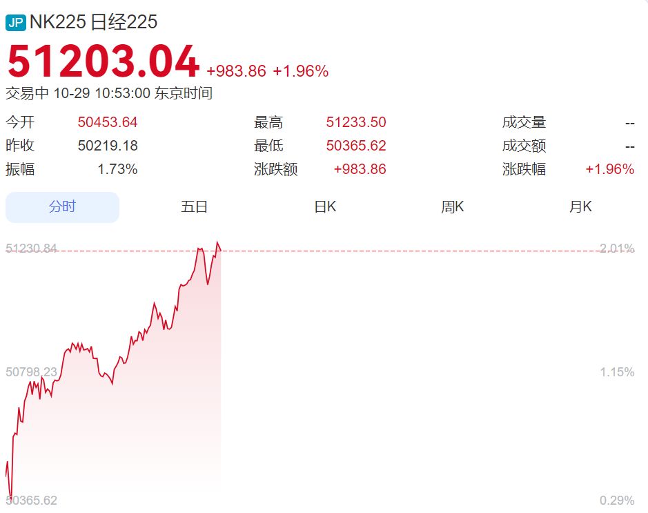 每经编辑|毕陆名 10月29日盘中,日经225指数持续走高,一度突破51000点,为历史首次,日内涨1.96%。