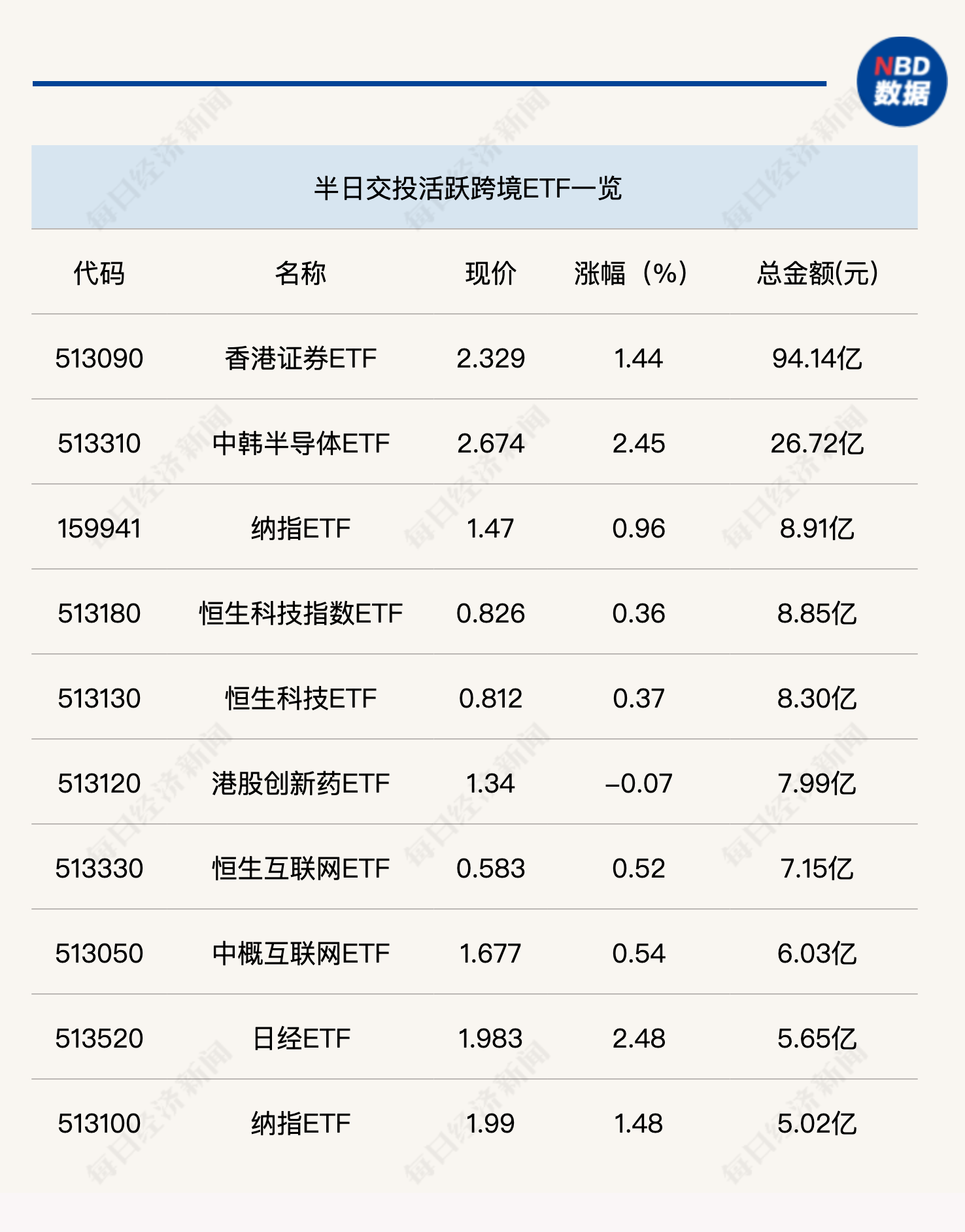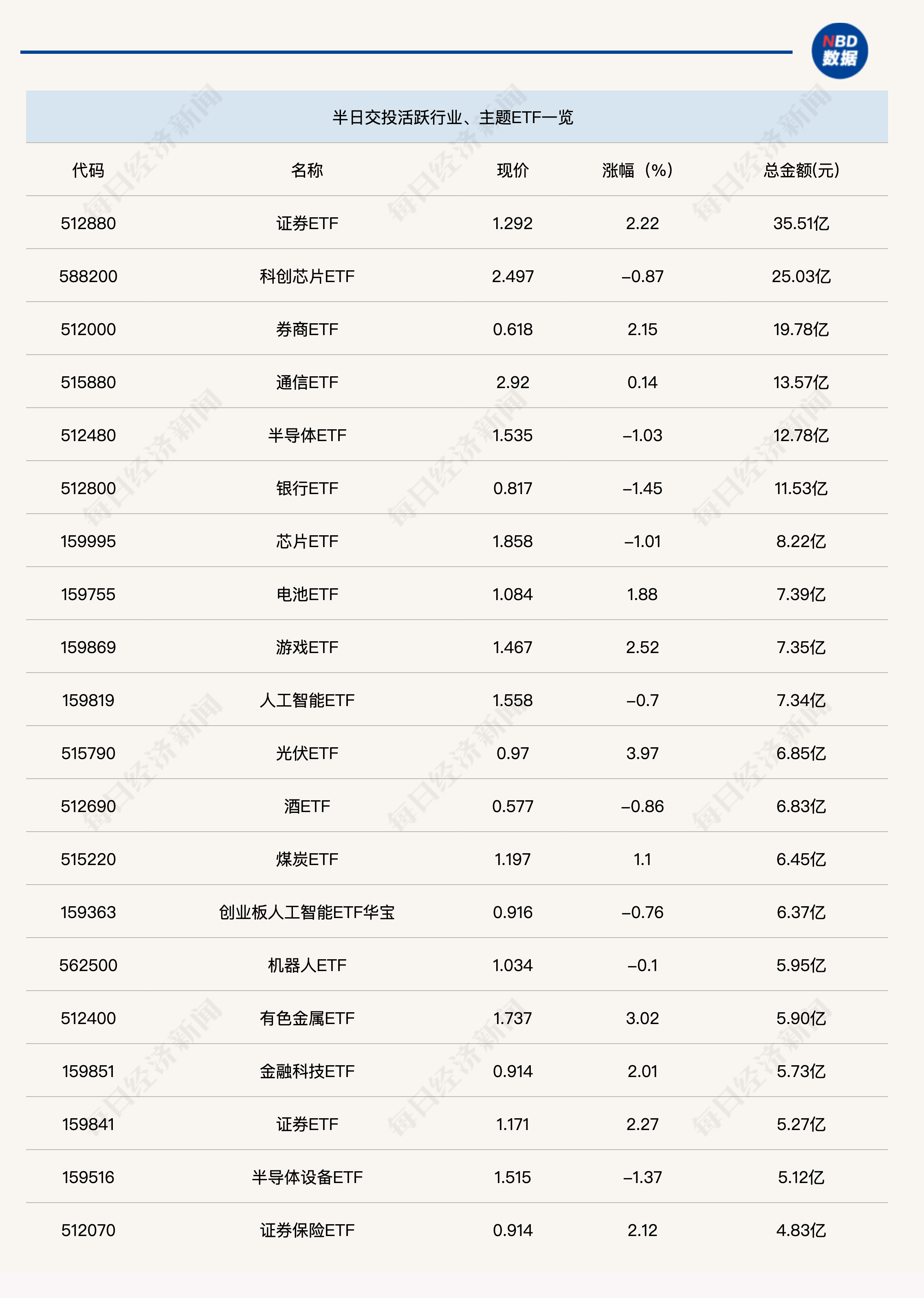 每经记者|刘明涛 每经编辑|肖芮冬 今日上午,证券ETF(512880)表现活跃,半日成交金额高达35.51亿元;券商ETF(512000)半日成交金额也近20亿元。跨境ETF方面,交易活跃性有所下降,仅香港证券ETF(513090)和中韩半导体ETF(513310)半日成交金额超过10亿元。