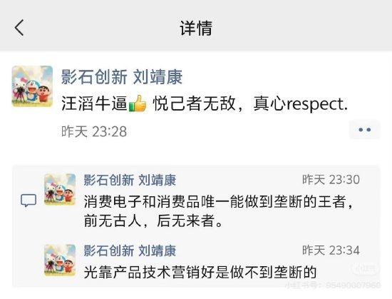 他表示真心敬佩汪滔,称汪滔是消费电子和消费品唯一能做到垄断的王者,前无古人,后无来者。刘靖康还表示,“光靠产品技术营销好是做不到垄断的。”