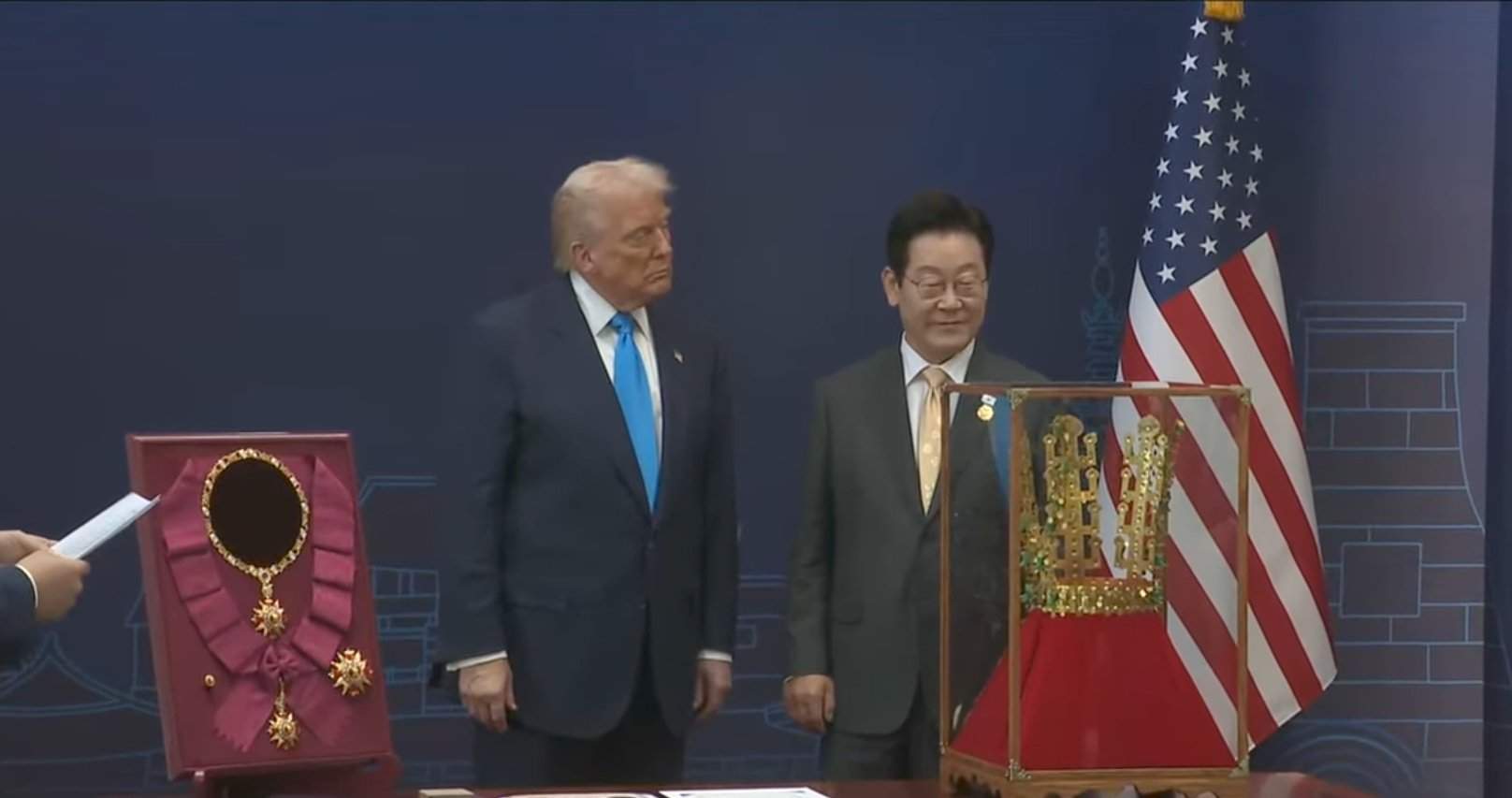 格隆汇10月29日|韩国总统李在明在亚太经合组织峰会期间与美国总统唐纳德・特朗普会面。期间,李在明向特朗普赠送了一顶韩国国宝新罗金冠的复制品和木槿花大勋章。特朗普成为首位获颁韩国最高等级国家勋章的美国总统。此次授勋仪式旨在表彰特朗普为朝鲜半岛和平所做的贡献。