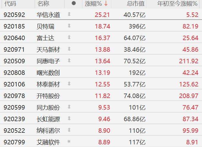 格隆汇10月29日|北交所个股午后持续走强,北证50指数拉升涨近9%。成分股中,华信永道涨25%,贝特瑞涨超18%,富士达涨超16%,天马新材、同惠电子、曙光数创涨超13%。消息面上,北交所董事长鲁颂宾在10月29日的2025金融街(000402)论坛年会上表示,持续优化北交所指数体系建设,加快推出北证50ETF,研究引入盘后固定价格交易,不断提升投资交易便利性。