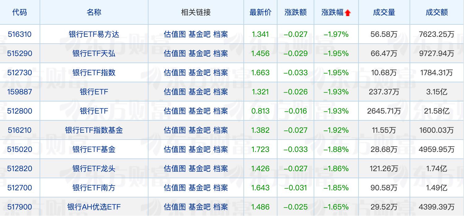 下跌方面,银行股集体下跌,银行相关ETF悉数回调,最大跌幅为1.97%。