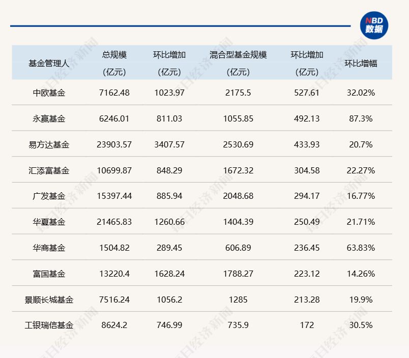 三季度混合型基金规模增长排名前十公司(数据来自Wind)