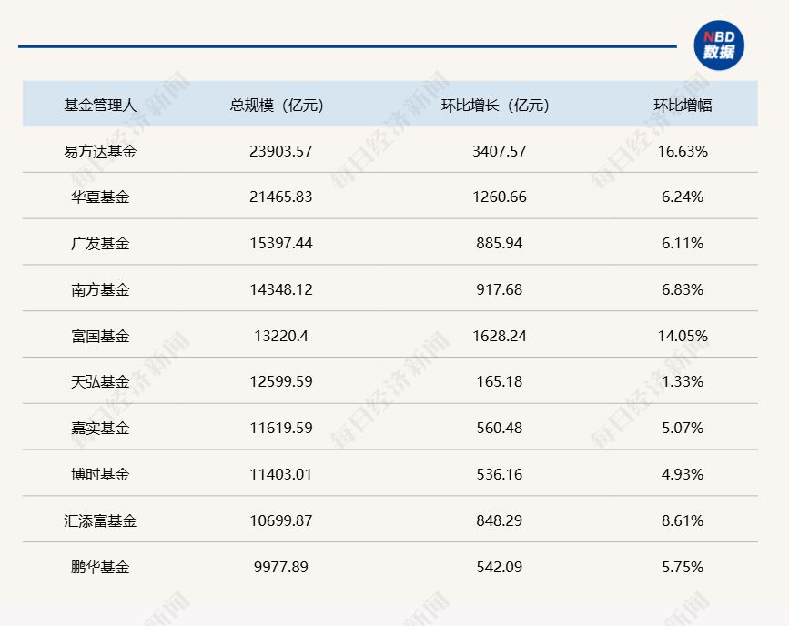 从不同类型的产品情况来看,由于三季度A股市场“慢牛”延续,主动权益产品表现良好,也获得了资金的持续流入。 增长最多的是股票型基金,单季度规模增加破万亿,达到1.09万亿元;其次是混合型基金,也久违地出现了显著增长,相比二季度末规模增长5938.07亿元;另外,货币基金三季度也环比增加4354.44亿元,增长超过千亿元的还有QDII基金,环比增加了1817.78亿元。 也有基金在三季度出现了规模缩水,那就是债券型基金,单季度缩水了2417.06亿元。 再来看看细分领域产品的规模变动情况。增长最多的是被动指数型基金,三季度大涨9471.26亿元,成为公募基金总体增长的“半壁江山”。 其次是二级债基,在三季度迎来了一波爆发,环比增加了5008.61亿元,增长可观。 另外由于三季度A股市场的持续上涨,偏股混合型基金、灵活配置型基金等主动权益类基金的规模增长都超过千亿元,分别环比增加了4322.73亿元、1466.35亿元,普通股票型基金增长也达到977.80亿元。环比增长超过千亿元的还有国际(QDII)股票型基金,三季度增加了1559.22亿元。 基金公司最新规模排名出炉 非货基座次生变看完了行业整体情况,我们再来看看不同基金管理人的规模排名。 首先从总规模前十的公司来看,变动并不大。截至三季度末,共有9家公司总规模超过万亿元,“万亿俱乐部”成员又增加了一名。 排在前四名的依然是易方达基金、华夏基金、广发基金和南方基金,管理总规模分别为2.39万亿元、2.15万亿元、1.54万亿元和1.43万亿元。但第五名和第六名互换了位置,富国基金以1.32万亿元的总规模跻身前五行列,天弘基金则环比下降一名、以1.26万亿元排在第六位。 从第七到第十位座次不变,但汇添富基金在三季度末规模也突破万亿元大关、达到1.07万亿元,成为“万亿俱乐部”的一员。