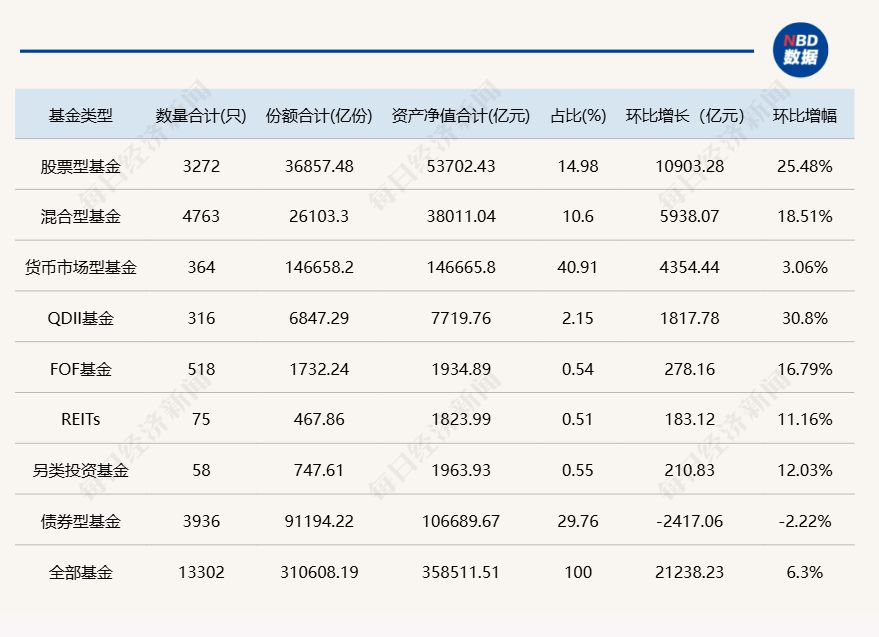 公募基金三季报披露完成,公募行业的相关数据也随之出炉。 《每日经济新闻》记者梳理发现,截至今年三季度末,全市场共有13302只公募基金产品,总规模突破35万亿元,达到35.85万亿元。与二季度末相比,股票型基金、混合型基金和货币型基金分别增长了1.09万亿元、5938.07亿元和4354.44亿元,成为三季度基金规模增长的主力军。其中被动指数基金单季度增长了惊人的9471.26亿元,总规模也达到4.5万亿元,成为规模增加最多的产品类型。 而从基金管理人的角度来看,截至三季度末“万亿俱乐部”成员增加至9家,其中规模超过2万亿元的仍然是易方达基金和华夏基金。指数基金,尤其是ETF产品,依然是管理人规模增长的“利器”,有公司三季度ETF增长近2000亿元。另外,由于三季度市场的良好表现,不少公司的主动权益类产品在三季度迎来了明显增长。 三季度公募总规模增长超2万亿元 这类产品贡献“半壁江山”据Wind数据,截至今年三季度末,全市场共有13302只公募基金产品,总规模35.85万亿元,相比二季度末增长了2.12万亿元,依旧保持了较快的增长速度。
