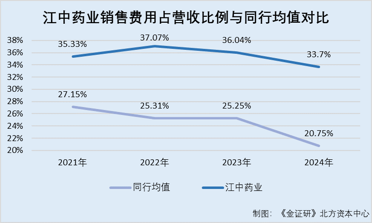 据江中药业2025年三季报,2025年1-9月,江中药业实现营业收入29.33亿元,同比增长-6.28%,归母净利润为6.83亿元,同比增长5.54%。 可见,2018-2024年,江中药业的营收增速坐“过山车”,净利润除了2019年均保持正增长,而2025年前三季度,江中药业的营收较上一年同期有所下滑。 2.2 近四年一期非处方药贡献超六成收入,2024年多款处方药库存量同比增加 据江中药业2021-2024年年报及2025年三季报,2021-2024年及2025年1-9月,江中药业非处方药收入分别为21.58亿元、26.18亿元、30.5亿元、32.66亿元、20.86亿元,占营业收入的比例分别为73.91%、64.37%、66.99%、73.63%、71.12%。 可见,2021-2024年及2025年1-9月,非处方药为江中药业贡献均超六成收入。 据江中药业2023-2024年年报,江中药业产品分类为非处方药、处方药、健康消费品及其他。其中,非处方药业务坚持走“大单品、强品类”的发展之路,巩固“脾胃、肠道”品类优势,并向“咽喉咳喘、补益维矿”拓宽赛道。 需要指出的是,江中药业非处方药主要产品有健胃消食片、乳酸菌素片、复方草珊瑚含片、双歧杆菌三联活菌肠溶胶囊(贝飞达)等。其中,健胃消食片系其核心产品,且2023年,江中药业脾胃品类核心大单品健胃消食片收入规模重回11亿元,该产品收入规模2024年双位数增长。 据江中药业2024年年报,2024年,江中药业健胃消食片、乳酸菌素片、多维元素片、复方草珊瑚含片、双歧杆菌三联活菌肠溶胶囊的库存量较上年同比增长率分别为-21.9%、25.98%、18.73%、153.54%、1,000%。 可见,2024年,江中药业乳酸菌素片、多维元素片、复方草珊瑚含片、双歧杆菌三联活菌肠溶胶囊等多款处方药的库存量较上一年有所增加。 需要注意的是,江中药业的销售费用占比高于同行均值。 2.3 2022-2024年销售费用均超14亿元,占营收比例均超三成且高于同行均值 据江中药业2022-2024年年报及2025年三季报,2021-2024年及2025年1-9月,江中药业销售费用分别为10.31亿元、15.08亿元、16.41亿元、14.95亿元、8.84亿元。 经测算,2021-2024年及2025年1-9月,江中药业销售费用占其当期营业收入的比例分别为35.33%、37.07%、36.04%、33.7%、30.13%。 需要说明的是,江中药业选取的同行业可比企业分别为云南白药(000538)集团股份有限公司(以下简称“云南白药”)、北京同仁堂(600085)股份有限公司(以下简称“同仁堂”)、华润三九(000999)医药股份有限公司(以下简称“华润三九”)、浙江康恩贝(600572)制药股份有限公司(以下简称“康恩贝”)、葵花药业(002737)集团股份有限公司(以下简称“葵花药业”)、亚宝药业(600351)集团股份有限公司(以下简称“亚宝药业”)。 据云南白药、同仁堂、华润三九、康恩贝、葵花药业、亚宝药业的2022-2024年报,经测算,2021-2024年,上述六家可比公司的销售费用占营业收入比例的平均值分别为27.15%、25.31%、25.25%、20.75%。