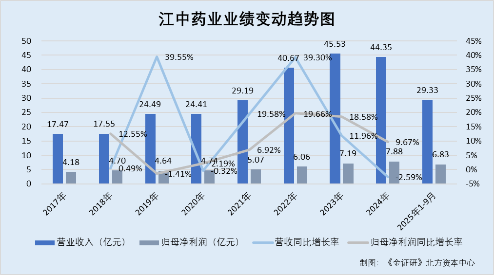 上述已知,江中药业2023年的投入资本回报率已达到18.3%,且其当年研发投入强度超4%。可见,第二期股权激励计划的部分业绩考核目标,或在2023年已实现。 江中药业表示,公司于2021年和2024年发布了2期股权激励计划,目前仅实施了2021年的第一期股权激励计划,2024年发布草案的第二期股权激励计划尚未取得批复和实施。其中第一期股权激励计划激励对象合计104人。 2021-2023年,公司营业收入年复合增长约24%,同期申万中药板块平均营业收入年复合增长率约为5%;公司归母净利润年复合增长约18%,同期申万中药板块平均归母净利润年复合下降约9%;公司净资产收益率ROE(加权)分别实现12.52%、14.53%、17.75%,同期申万中药板块ROE(加权)中位数分别为8.05%、8.26%、7.58%,优于行业水平。截至2024年,公司股票市值已连续5年实现正增长。 在江中药业第二期限制性股票激励计划草案中,归母净利润年复合增长率和投入资本回报率两项指标都明显高于近年行业水平。设置更具挑战和压力的考核指标,体现了公司助力经济长期稳定发展的国企担当。 而第二期限制性股票激励计划的业绩考核条件中,要求江中药业2025-2027年三个会计年度的投入资本回报率均应不低于15.42%,研发投入强度应分别不低于3.91%、3.92%、3.93%。对于第二次限制性股票激励计划业绩考核中的投入资本回报率、研发投入强度指标,或在2023年已实现,江中药业第二期股权激励计划是否上演业绩考核部分指标“开倒车”的异象,或值得关注。 二、多款处方药库存量增加,营销及广告宣传促销费合计超14亿元且占销售费用比重走高 近年来,上市药企销售费用持续受到监管机构和投资者关注。在此背景下,江中药业2022-2024年销售费用占营收比例高于同行均值。且其2024年销售费用中营销开支及广告宣传促销费合计超12亿元,占销售费用比例上升至84.65%。 2.1 2018-2024年营收增速坐“过山车”,2025年1-9月营收现负增长 据江中药业2019-2024年年报,2017-2024年,江中药业营业收入分别为17.47亿元、17.55亿元、24.49亿元、24.41亿元、29.19亿元、40.67亿元、45.53亿元、44.35亿元,归母净利润分别为4.18亿元、4.7亿元、4.64亿元、4.74亿元、5.07亿元、6.06亿元、7.19亿元、7.88亿元。 根据《金证研》北方资本中心研究,2018-2024年,江中药业营业收入增速分别为0.49%、39.55%、-0.32%、19.58%、39.3%、11.96%、-2.59%,归母净利润增速分别为12.55%、-1.41%、2.19%、6.92%、19.66%、18.58%、9.67%。