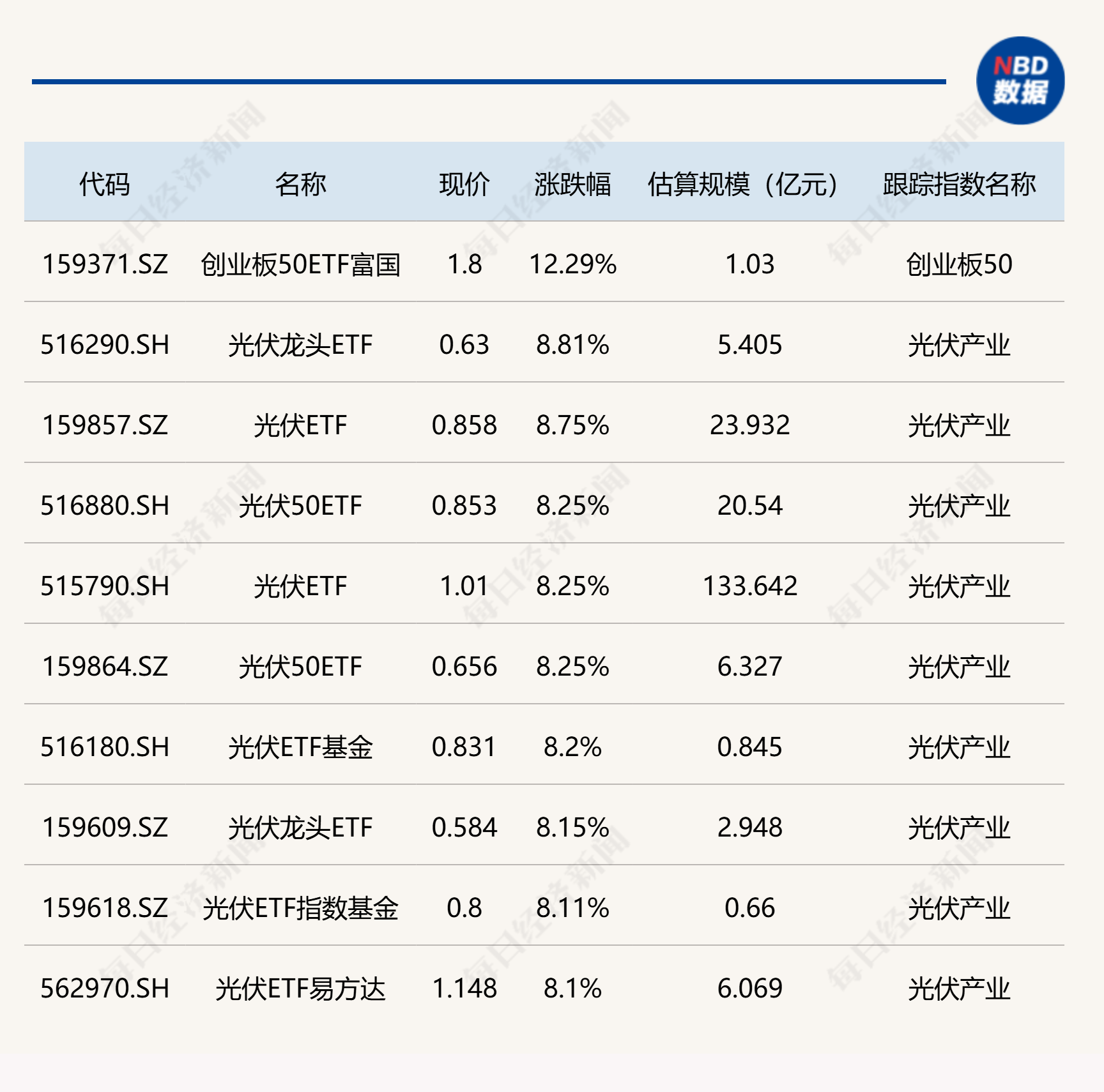 每经记者|叶峰 每经编辑|赵云 市场全天震荡拉升,三大指数高开高走,创业板指涨近3%创年内新高,沪指再度回升至4000点上方,北证50指数涨超8%。盘面上,储能板块表现活跃,光伏板块爆发,有色金属板块盘中拉升,固态电池概念股持续走强。下跌方面,银行股集体调整。 ETF涨跌幅方面,创业板50ETF富国涨超12%,但溢价超8%。