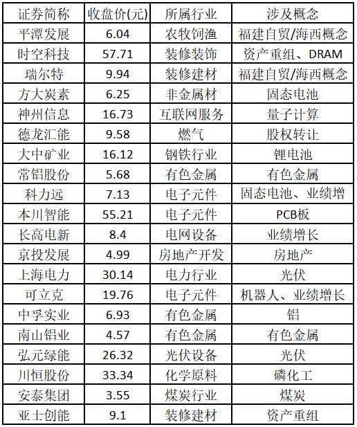 (注:创出历史新高的涨停股,说明该股人气旺盛、趋势明确,且上方无阻力,延续原上涨趋势概率较大。) 涨停板个股中,股价创出近一年新高的个股有20只(不包括创出历史新高的个股),包括平潭发展、时空科技、瑞尔特、方大炭素、神州信息、德龙汇能、大中矿业、常铝股份、科力远、本川智能、长高电新、京投发展、上海电力、可立克、中孚实业、南山铝业、弘元绿能、川恒股份、安泰集团、亚士创能,具体如下表所示。
