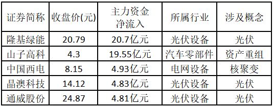 (注:创出近一年新高的涨停股,说明该股走出重要突破行情,值得重点关注。) 从主力资金来看,今日涨停板个股中,主力资金净流入金额排名前5的个股分别是隆基绿能、山子高科、中国西电、晶澳科技、通威股份。