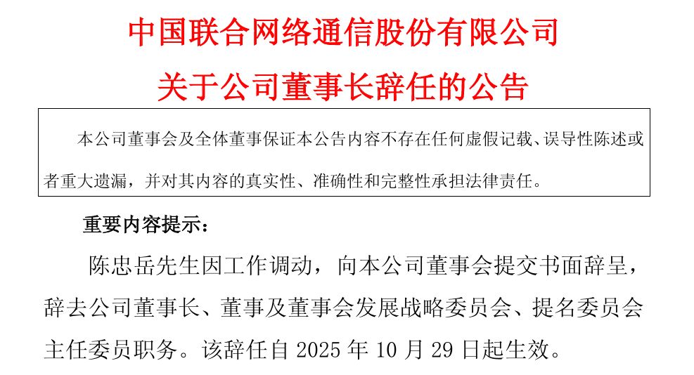 每经编辑|张锦河 10月29日,中国联通公告,公司董事长陈忠岳因工作调动,申请辞去公司董事长、董事等职务,该辞任自2025年10月29日起生效。陈忠岳辞任后将不再担任公司任何职务。