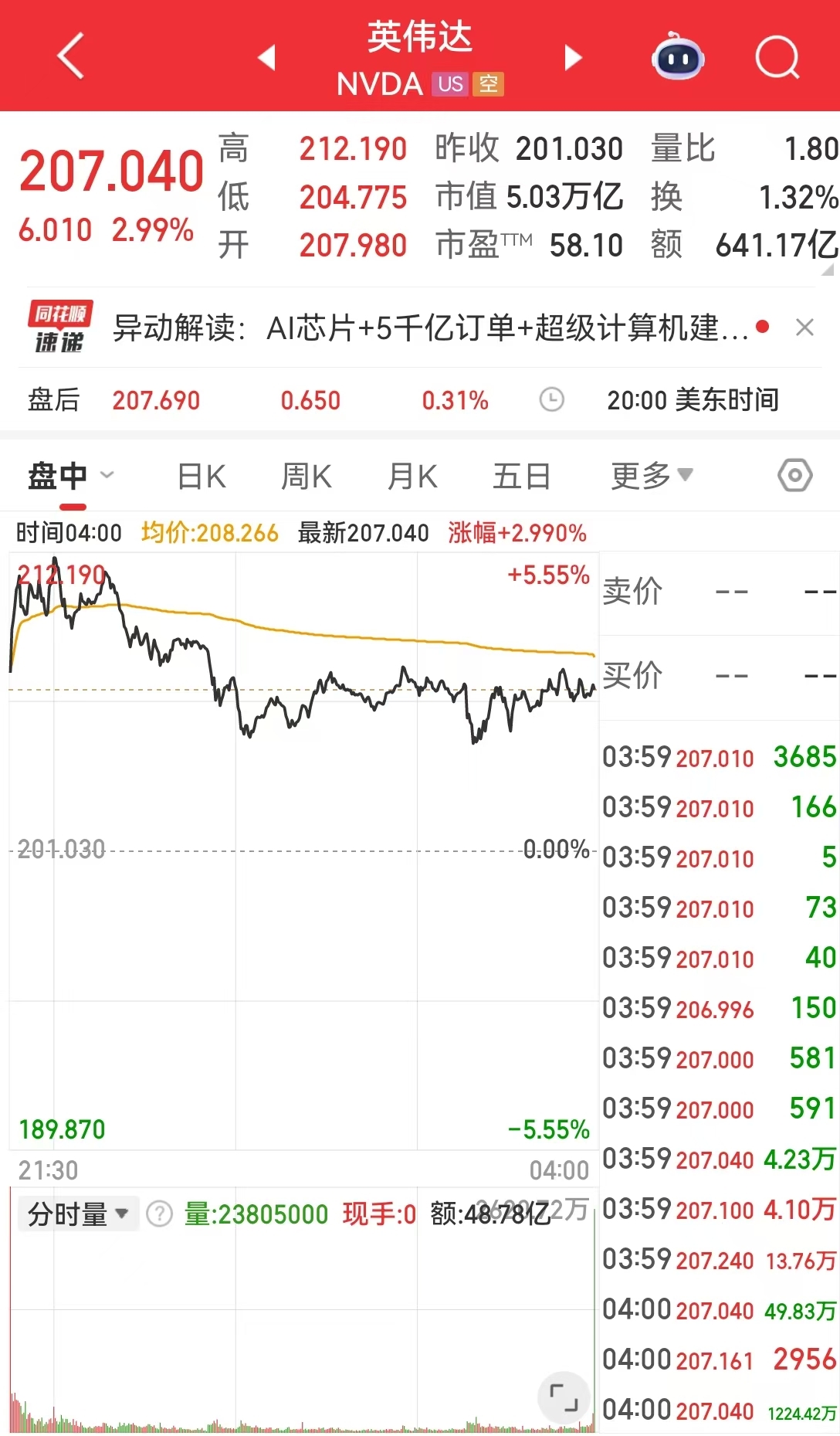 每经编辑|杜宇 当地时间10月29日,英伟达股价大幅上涨,截至收盘,英伟达报207.04美元,最新总市值5.03万亿美元,其市值一夜增加1460亿美元(约合人民币10363.81亿元)。