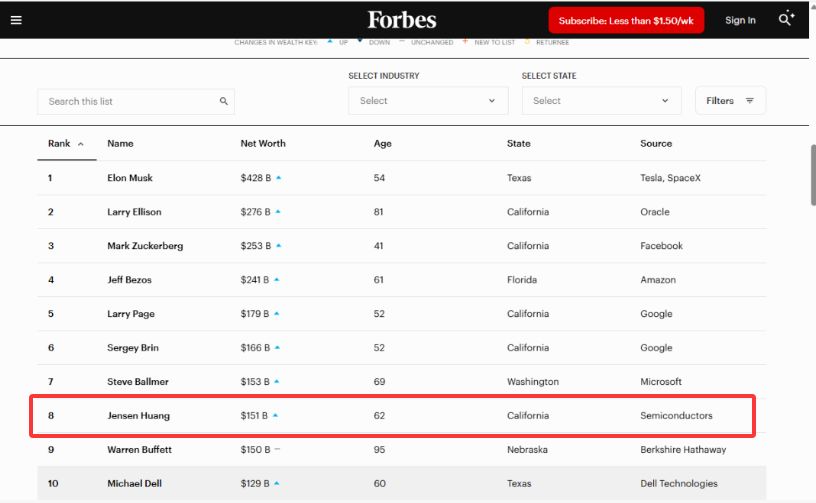 英伟达公司总市值从4万亿美元跨越5万亿美元,仅用时113天,而从3万亿美元到4万亿美元则耗时410天。高达5万亿美元的总市值,早已超过英、法、德等国家的股市总市值,这一数字正逼近印度股市总价值(5.3万亿美元)。 随着英伟达股价的大幅上涨,福布斯实时富豪榜显示,黄仁勋的个人财富上升至福布斯富豪榜第八位。