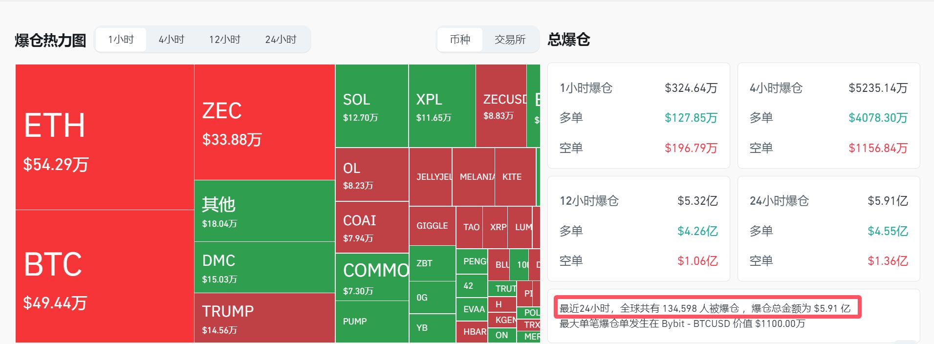 截至发稿时,比特币下跌1.61%报11.05万美元,以太坊跌1.26%,XRP的跌幅超1%。 coinglass数据显示,24小时内,加密货币全网合约爆仓5.91亿美元,爆仓人数达到13.45万人。