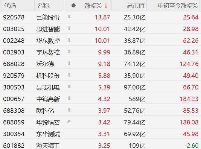 格隆汇10月30日|A股市场工业母机概念股集体上涨,截至半日收盘,巨能股份涨超13%,思进智能、华东数控(002248)、宇环数控(002903)10CM涨停,沃尔德(688028)涨超9%,机科股份、昊志机电(300503)涨超5%。