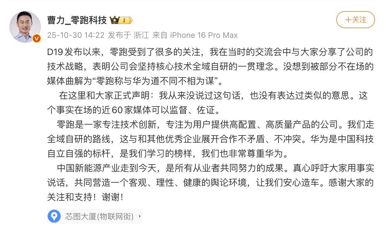 每经编辑|黄胜 10月30日,针对“零跑称与华为道不同不相为谋”的说法,零跑汽车高级副总裁曹力在社交平台发布声明称,从来没说过这句话,也没有表达过类似的意思。 “我们走全域自研的路线,这与和其他优秀企业展开合作不矛盾、不冲突。华为是中国科技自立自强的标杆,是我们学习的榜样,我们也非常尊重华为。”他写道。