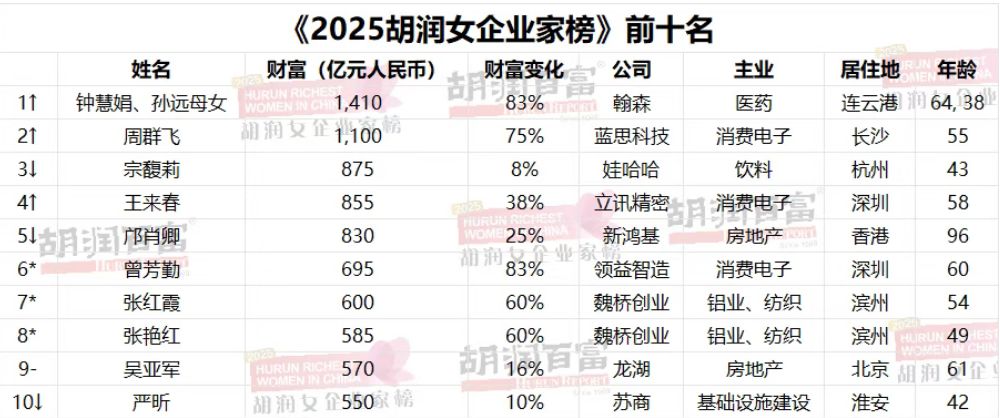 每经编辑|杜宇 10月30日,胡润研究院发布《2025胡润女企业家榜》,列出了今年胡润百富榜中的前50名女企业家。 来自中国创新药头部企业翰森的钟慧娟、孙远母女,以1410亿元财富首次成为中国女首富;蓝思科技周群飞财富增长470亿元,以1100亿元位列第二;宗馥莉以875亿元排名第三,较去年下降两位。