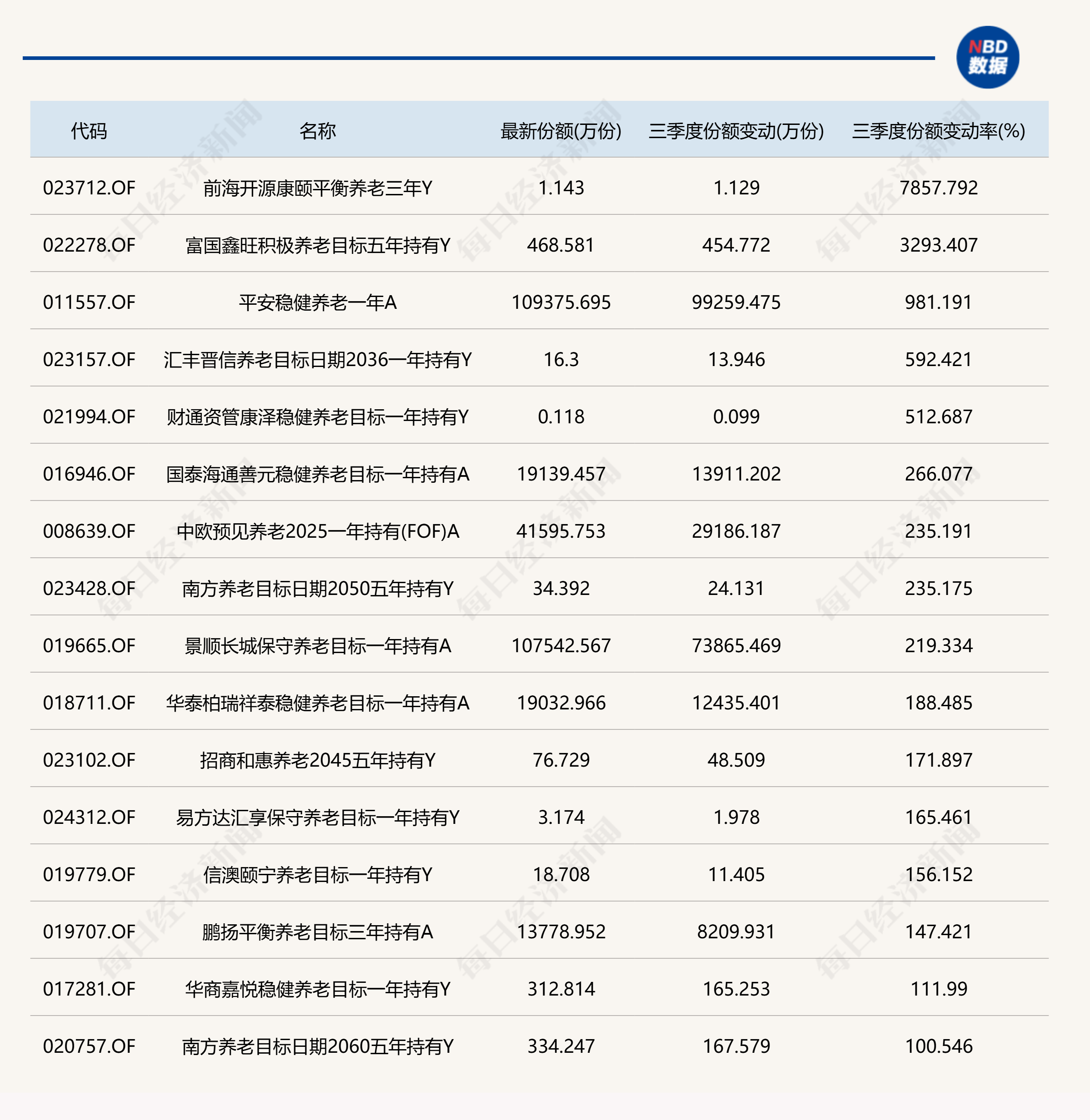 每经记者|黄小聪 每经编辑|叶峰 随着基金三季报披露完毕,三季度养老目标基金的份额变化情况也浮出水面。记者注意到,三季度共有16只养老目标基金的规模增长超过100%,但同时也有7只养老目标基金份额减少超过50%。 此外,在权益持仓方面,多只权益产品被10只以上的养老目标基金集体重仓,还有数十只基金被加仓超过1000万份。 16只养老目标基金规模增超100% Wind数据统计显示,三季度共有16只养老目标基金的规模增长超过100%,具体如下: