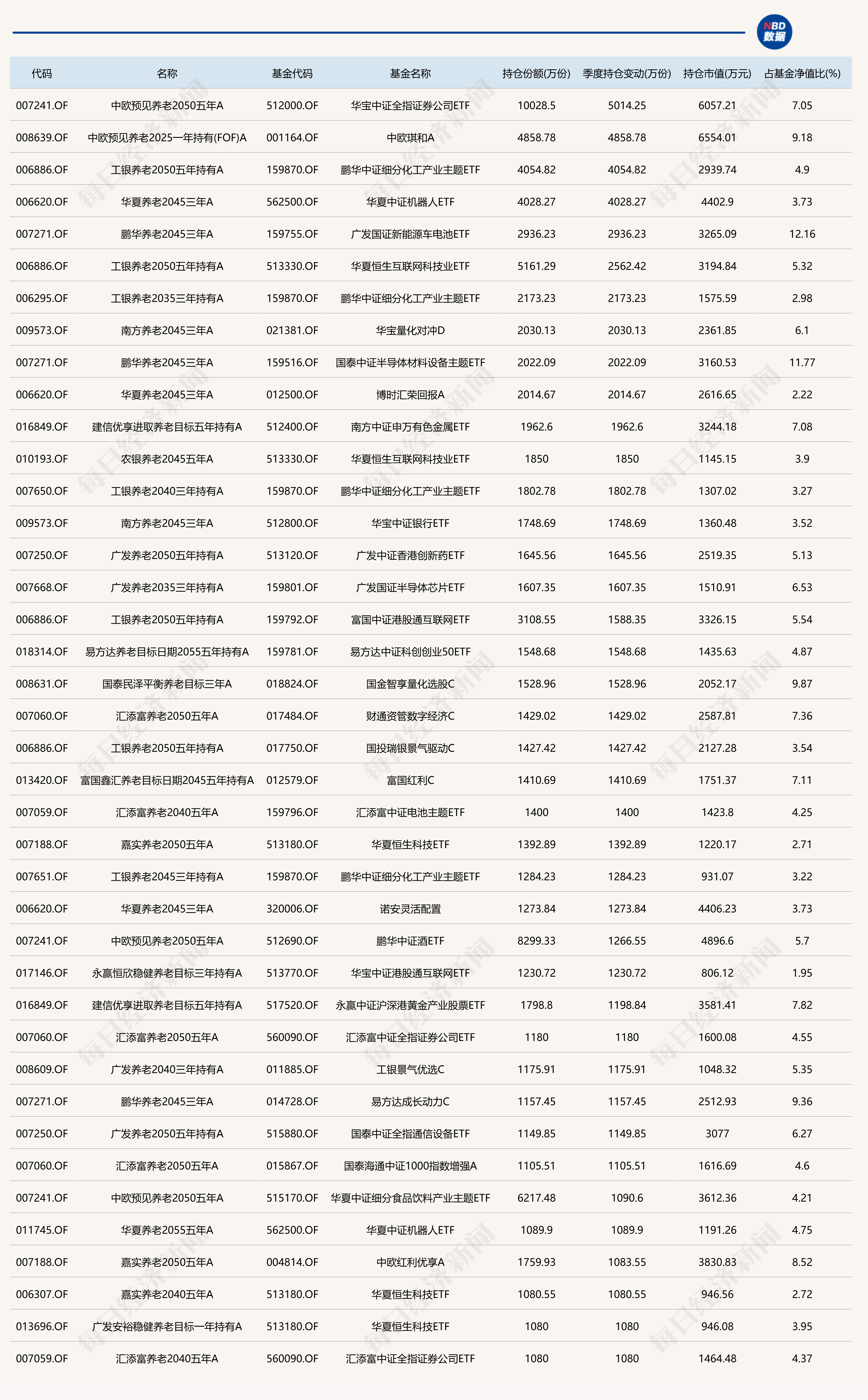 其中上银恒泰稳健养老目标一年持有期A单季度净赎回超过1.4亿份,份额降幅超过70%;财通资管康泽稳健养老目标一年持有A单季度净赎回超过6700万份,份额降幅超过60%。 还有景顺长城稳健养老目标三年A,单季度净赎回超7500万份,其中包括了基金公司自购的1000万份,基金公司自己在三季度也选择了赎回。 多只权益产品被10只以上养老目标基金持有 再来看养老目标基金三季度的权益持仓情况,Wind数据显示,有多只基金截至三季度末,被10只或10只以上的养老目标基金持有。 这其中包括了华安黄金ETF、华夏恒生科技ETF、富国沪港深业绩驱动A/C、富国稳健增长A/C、富国中证港股通互联网ETF、广发纳斯达克100ETF、博道成长智航C、财通资管数字经济C、景顺长城品质长青C、诺安多策略C、易方达成长动力C等。 而如果从持仓的变化数量来看,数十只产品获得养老目标基金超过1000万份的增仓,比如中欧预见养老2050五年,买入华宝中证全指证券公司ETF超过5000万份;工银养老2050五年持有,买入鹏华中证细分化工产业主题ETF超过4000万份。
