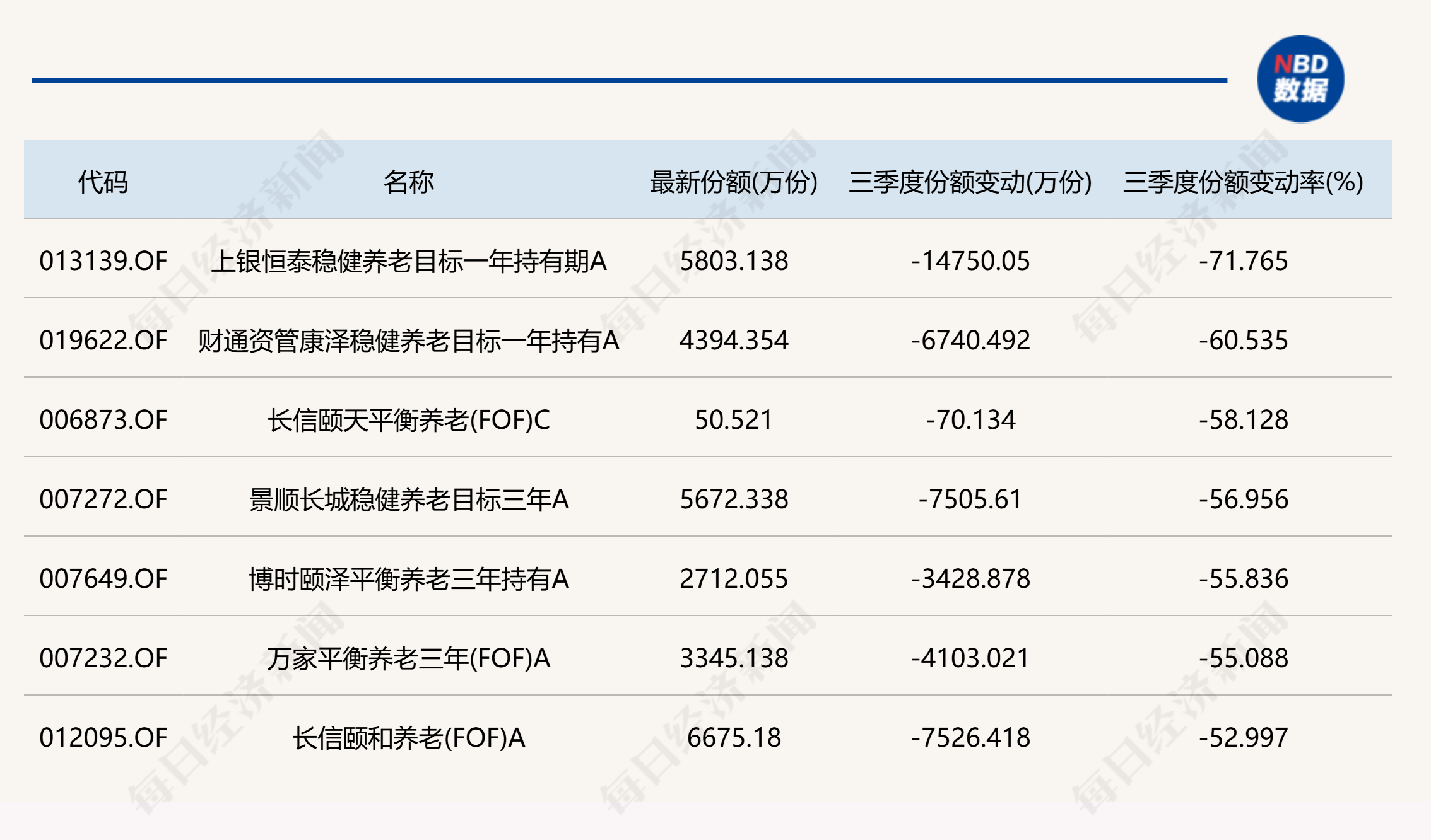 从这些产品来看,有的本来规模就非常小,因此只要稍有增长,比例就很大,比如前海开源康颐平衡养老三年Y,份额增长后也只有1万多份。 如果看规模超过1亿份的产品,有几只在三季度规模增长非常明显,比如平安稳健养老一年A,单季度增加了9.9亿份;景顺长城保守养老目标一年持有A,单季度增长超7亿份;中欧预见养老2025一年持有(FOF)A单季度增长2.9亿份。 7只养老目标基金单季度规模降超50% 除了这些规模大增的产品,还有些养老目标基金在三季度则是出现了规模的大幅下降。 Wind数据显示,单季度规模降幅超过50%的养老目标基金共有7只,具体如下: