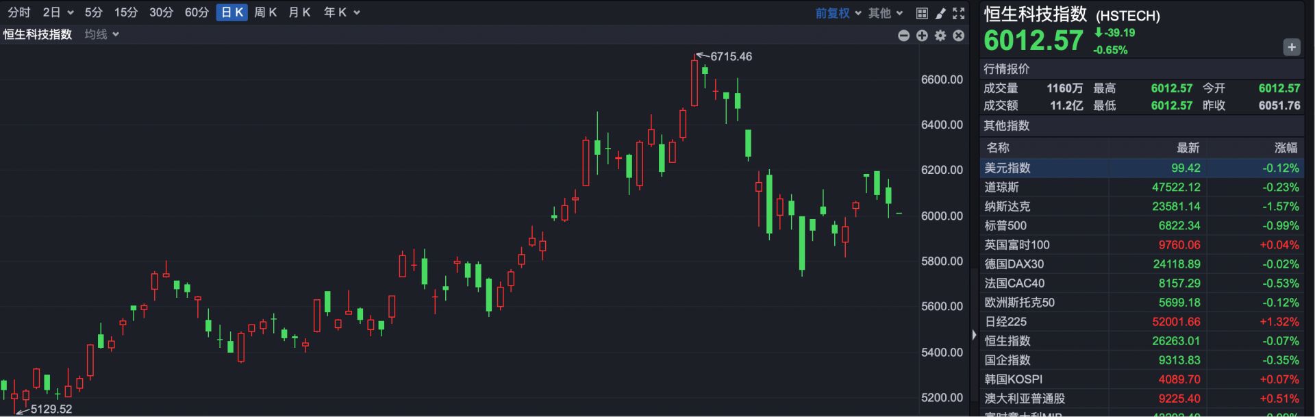 恒生科技指数开盘报6012.57点,下跌39.19点,跌幅0.65%。