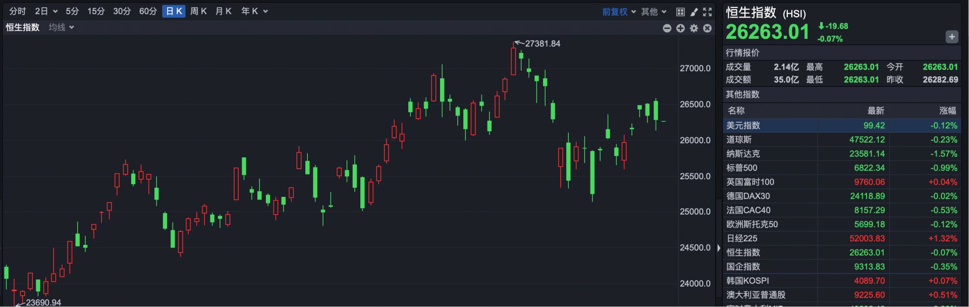每经记者|曾子建 每经编辑|袁东 10月31日早盘,港股市场微跌开盘。 截至发稿,恒生指数开盘报26263.01点,下跌19.68点,跌幅0.07%。