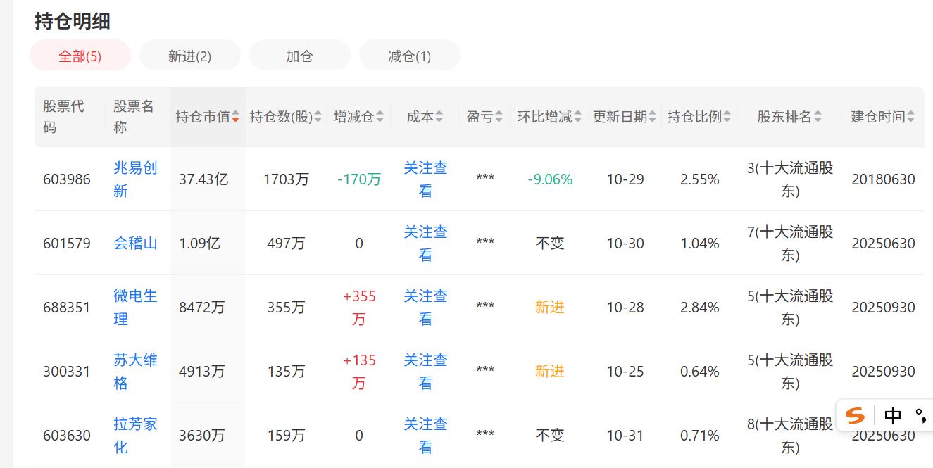 与此同时,葛卫东对光刻机概念股苏大维格的操作则不同。早在今年一季度末,葛卫东就曾以162万股的持仓位列公司第八大流通股东。但二季度末,葛卫东对其进行了减持操作,退出了前十大流通股东。之后又通过三季度的加仓重返公司前十大流通股东阵营。数据显示,三季度末葛卫东持股135万股,市值约为4913万元。 值得一提的是,9月17日,苏大维格发布的投资者关系管理信息显示,9月2日至9月17日,葛卫东参与了该公司的调研。另外,汇添富基金、华安基金、国泰基金等机构投资者也出现在调研名单中。关注的重点主要是苏大维格收购常州维普半导体设备有限公司的相关情况,以及苏大维格旗下高端导光材料业务、触控业务等发展情况。 此外,三季度葛卫东另一个引人注目的操作是少量减持了兆易创新。 兆易创新是今年半导体的大牛股,今年年初至10月31日,涨幅超过100%。一直以来,葛卫东都重仓兆易创新,在本轮上涨中赚得盆满钵满。今年三季度,葛卫东在兆易创新上涨过程中减仓了170万股;但剩余持仓仍达到1703万股,市值高达37.43亿元,为其第一大重仓股。值得一提的是,近期兆易创新股价再创新高。如果葛卫东近期没有减持,那么兆易创新每涨跌1%,他的持仓市值波动就高达300万元以上。