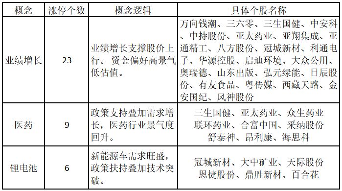 (注:行业涨停板个股越多,说明该行业被资金重点关注,是当前热门行业。) 从概念特征来看,今日涨停板个股中,业绩增长、医药、锂电池概念的个股最多。