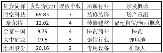 (注:封板资金越多的个股,说明该股被资金追捧,其延续上涨概率较大。) 从连板情况来看,今日首板个股有48只;2连板的个股有5只;3连板及以上的个股有4只。今日连板数排名前5的个股包括时空科技、瑞尔特、合富中国、大中矿业、泰坦股份,具体如下表所示。