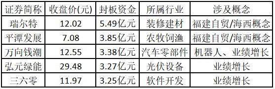 (注:主力资金净流入金额占市值比例越高的个股,说明该股被主力资金重点关注,值得重点关注。) 从封板资金来看,今日涨停板个股中,封板资金排名前5的个股包括瑞尔特、平潭发展、万向钱潮、弘元绿能、三六零。欢迎大家关注微信公众号“道达号”,其“道达涨停复盘”栏目为大家解读。
