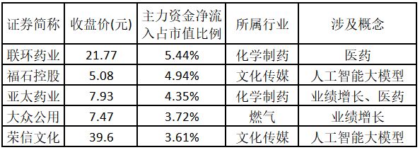 (注:主力资金净流入金额越多的涨停股,说明该股被主力资金重点关注,值得重点关注。) 主力资金净流入金额占市值比例排名前5的个股分别为联环药业、福石控股、亚太药业、大众公用、荣信文化。