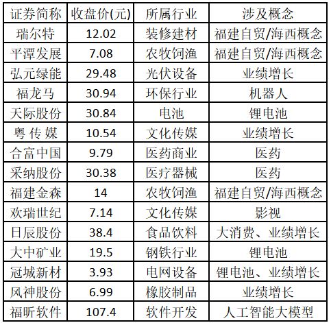 (注:创出历史新高的涨停股,说明该股人气旺盛、趋势明确,且上方无阻力,延续原上涨趋势概率较大。) 涨停板个股中,股价创出近一年新高的个股有15只(不包括创出历史新高的个股),包括瑞尔特、平潭发展、弘元绿能、福龙马、天际股份、粤传媒、合富中国、采纳股份、福建金森、欢瑞世纪、日辰股份、大中矿业、冠城新材、风神股份、福昕软件,具体如下表所示。
