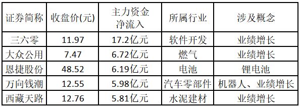 (注:创出近一年新高的涨停股,说明该股走出重要突破行情,值得重点关注。) 从主力资金来看,今日涨停板个股中,主力资金净流入金额排名前5的个股分别为三六零、大众公用、恩捷股份、万向钱潮、西藏天路。
