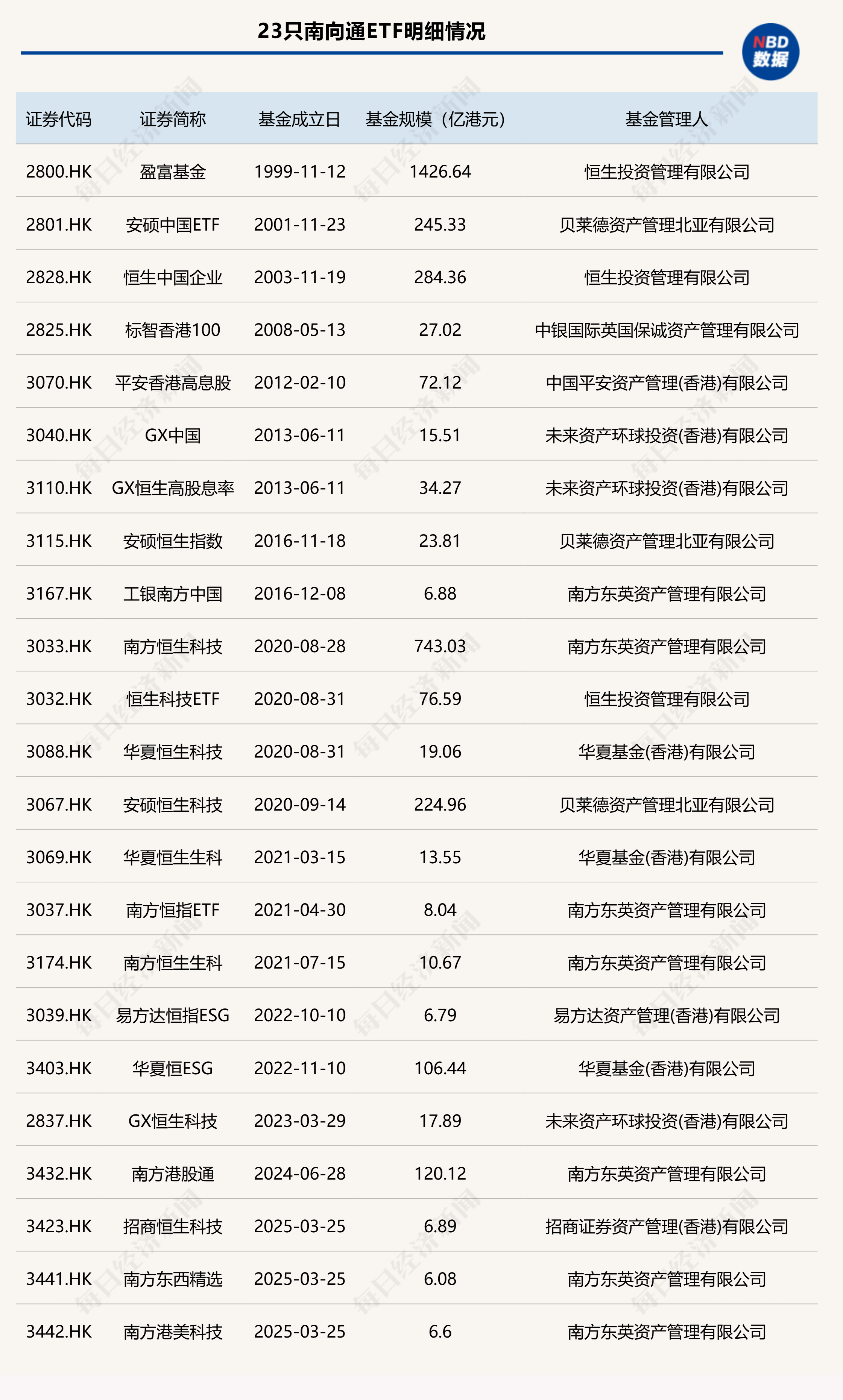数据来源:Wind(截至10月30日) 记者注意到,这23只产品中有7只来自南方东英资管,另外未来资产环球投资(香港)、华夏基金(香港)、恒生投资和贝莱德资管北亚也各有3只产品在列。 据了解,今年以来,港股通南向资金交易活跃,ETF日均交易量也多次创下自互联互通开放以来的新高。香港交易所市场主管余学勤此前曾介绍,截至8月底,今年以来香港市场日均交易量达2480亿港元,南向通日均交易量1200亿港元,同比增长约2.4倍。其中,ETF日均交易量91亿港元,为互联互通开放以来最高水平。 对于此次南向ETF通的继续扩容,有公募人士对《每日经济新闻》记者分析,首次纳入的含美股资产ETF让投资者能借港股通低门槛布局全球核心资产,满足分散风险需求,同时也将进一步推动产品创新与生态完善。 封面图片来源:视觉中国-VCG111361568739 |