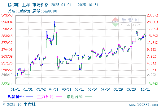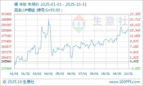 据生意社商品行情分析系统监测:本周(10.27-10.31)华东地区1#锡锭市场波动上涨,周初市场均价在283510元/吨,周末市场均价在284350元/吨,周涨幅0.30%。