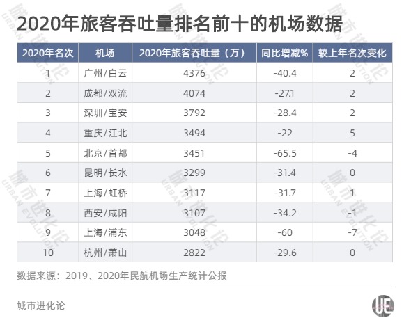 广州白云国际机场T3航站楼 图片来源:南方日报 当时,就有声音指出,广州机场旅客吞吐量已逼近2035年设计容量的八成。而根据白云机场此后回应,其T1、T2航站楼按年旅客吞吐量分别为3500万人次和4500万人次设计,共计仅8000万人次。 更显尴尬的是,对比2019年旅客吞吐量排名前四机场所在城市,彼时京沪第二机场均已投运,成都第二机场距离投运也仅剩一年时间,广州则成为唯一以白云机场一己之力支撑一市旅客吞吐量的城市,选址佛山的广州新机场,要等到2024年,才获得国家立项批复。 到了2020年,广州白云机场迎来旅客吞吐量首次登顶。有分析称,这一方面是由于此前位居“冠亚军”的北京、上海,因“双机场”造成了旅客分流,另一方面则是由于大湾区机场群的结构性支撑,部分香港机场旅客分流至广州。