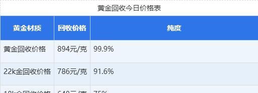 黄金回收今日价目表 目前黄金回收价格894元/克,22k黄金回收价格786元/克,au900黄金回收价格786元/克,18k黄金回收价格648元/克,14k金回收价格501元/克。