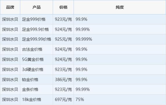 深圳水贝黄金金价查询 截止2025年10月31日 ,水贝黄金指发市场今日报价为每克 923元,工费另计,不同的黄金款式工费有所差异(每克10元至35元不等)。