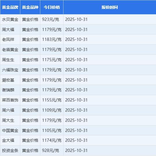 相信很多人都想了解各品牌金价今天什么价格?本文与大家一起聊聊各品牌金店黄金价格。 常见的黄金品牌金店有周大福、周生生、谢瑞麟、六福珠宝、潮宏基、金至尊珠宝、老凤祥、老庙黄金、菜百首饰等,大品牌的金价通常会相对较高一些,除因为工艺、款式外,还有品牌溢价的因素。 2025年10月31日国内足金首饰价格报价:金饰克价一夜下跌10元!各大品牌金店金饰克价927元到1179元区间,银行金条价格每克915元,白银价格10.8元,周大福、周大生、潮宏基、六福珠宝今日金价1179元,谢瑞麟今日金价1179元,周生生金价今日价格1175元,中国黄金今日金价1170元,老凤祥今日黄金价格1183元,水贝最新黄金价格922元,老庙黄金今日价格1179元,周六福黄金价格1104元,菜百今日金价1155元。 国际黄金价格报价