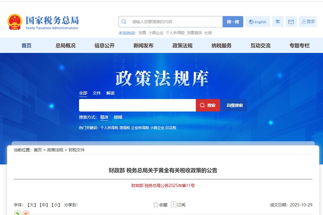 每经编辑|杜宇 11月1日,财政部、税务总局发布关于黄金有关税收政策的公告,会员单位或客户通过上海黄金交易所、上海期货交易所交易标准黄金,卖出方会员单位或客户销售标准黄金时,免征增值税。未发生实物交割出库的,交易所免征增值税;发生实物交割出库的,按照规定适用增值税政策。纳税人不通过交易所销售标准黄金,应按照现行规定缴纳增值税。公告自2025年11月1日起实施,执行至2027年12月31日,适用时间以发生实物交割出库的时间为准。