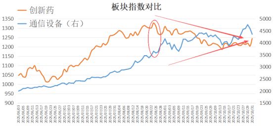 因此,本轮科技股调整,只是交易过度拥挤。即便是调整,在我看来,只能算休整而已,后面还会继续往上冲的。 创新药会是11月份新主线吗? 往大的方向来讲,行情存在红利与科技的跷跷板效应,但是科技内部也存在跷跷板效应,那就是通信设备与创新药。
