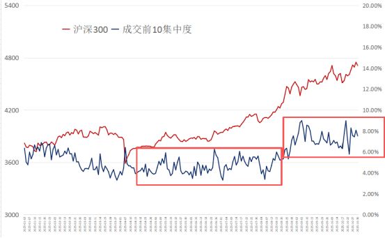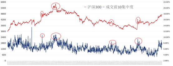 从去年9月24日至今,剔除2024年10月8日,选取了7个行情的阶段高点,然后统计成交额前5、前10、前20的交易集中度。我们会发现,该指标都普遍偏高,尤其是在10月29日的时候,这个维度的交易集中度都超过了前6个阶段高点。当时,小二把这个当风险点特意做了提示。 你们想啊,成交集中度越高,说明资金只去少数公司,对其他方向的关注度在变少,行情整体的持续性是变弱的。 如果拉长时间用这个指标去看A股的历史行情,也是阶段性有效的。 这里有张图,从2019年至今,虽然行情高点不一定反映出偏高的交易集中度,但是偏高的交易集中度基本都对应着行情阶段高点。